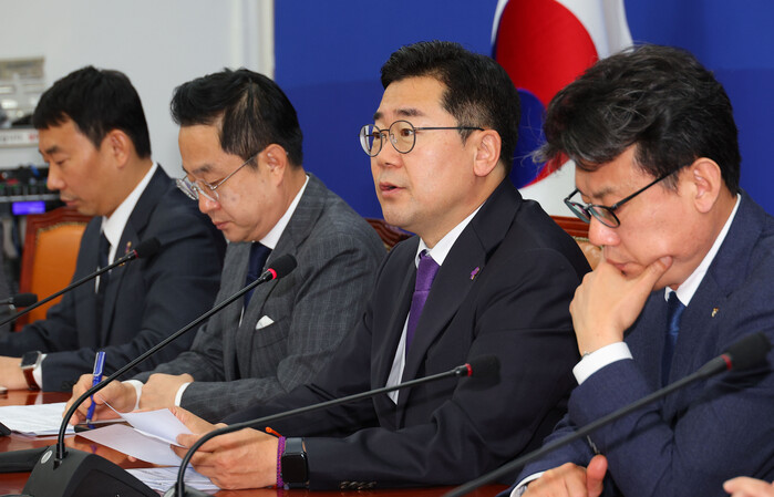박찬대 원내대표는 국회에서 열린 원내대책회의에서 "윤석열 캠프와 명태균 씨는 지난 대선에서 대체 무슨 짓을 한 것인가. 희대의 사기극이라도 작당한 것인가"라며 "대놓고 여론조작, 노골적 공천 개입, 최순실 뺨치는 국정농단의 증거들이 속속 드러나고 있다"고 비판했다.