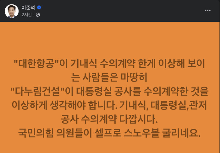 그는 “기내식, 대통령실, 관저공사 수의계약 다까자. 국민의힘 의원들이 셀프로 스노우볼 굴린다”고 여권을 향해 직격탄을 날렸다.