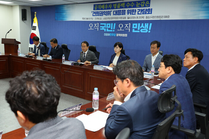 정무위 야당 간사인 강준현 의원은 간담회 이후 기자들과 만나 김 여사 청문회와 관련 "권익위 관련해 여러 정황이 있는데 다음 주 정무위원 구성이 이뤄지면 심도 있게 다루겠다"며 "현안 질의 청문회든 입법 청문회든 해야 한다"고 답했다.