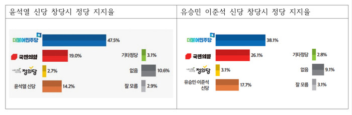 뉴스토마토 의뢰로 미디어토마토가 지난 10월 21일부터 22일, 전국 만 18세 이상 성인 1,015명을 대상으로 진행한 조사에 따르면, 내년 총선에서 '유승민·이준석 신당'이 창당할 경우 응답자의 17.7%가 '지지하겠다'고 응답했다. ‘윤석열 신당’은 14.2%로 나타났다.