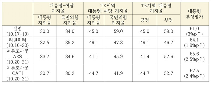 첫째, 대통령 지지율이 여당의 지지율보다 낮다. 둘째, 여당의 텃밭인 대구·경북 지역에서 대통령에 대한 긍정 평가보다 부정 평가가 더 높다. 셋째, 대통령에 대한 부정 평가가 다시 60%를 넘어섰다.