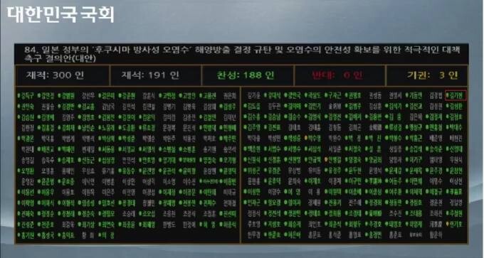 이 결의문은 재석 191인, 찬성 188인, 반대 0명의 압도적인 찬성으로 통과됐고 ‘치명적인 방사성 물질의 완전 제거는 어렵다. 국민 건강을 위해 끼칠 일본의 어떤 조치도 용납하지 않는다’는 동의를 이끌어 냈다.