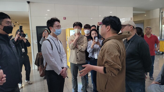| ▲ EBS 압수수색 막아선 전국언론노동조합 EBS지부 (사진=전국언론노동조합) |