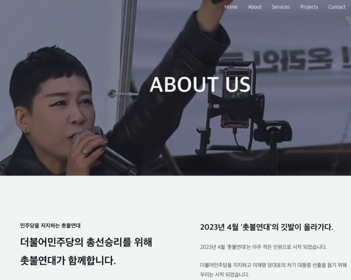 김 씨는 여전히 (현) 촛불연대 대표라고 본인의 경력을 소개하고 있다. 하지만 급조된 듯한 촛불연대 홈페이지에는 “민주당을 지지하는 촛불연대”라며 조국혁신당은 언급조차 없다.