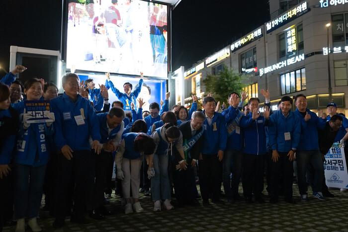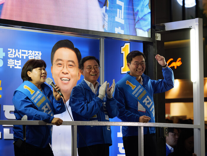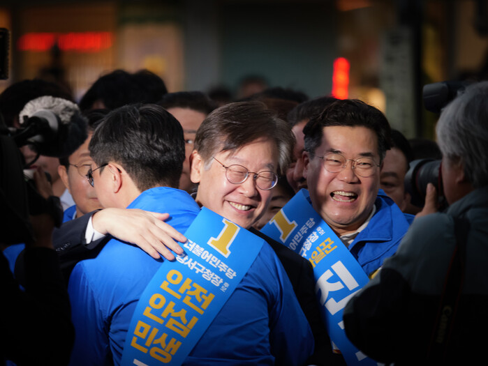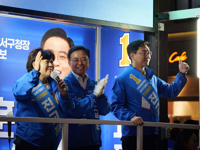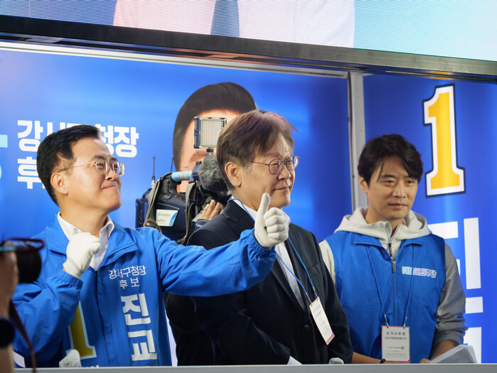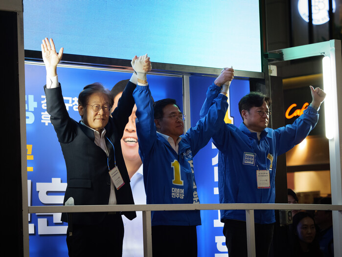 | ▲이재명 대표와 진교훈 후보, 홍익표 원내대표 (사진=시사타파뉴스 이외솔) |