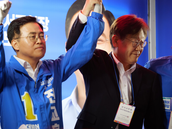 | ▲진 후보 손을 번쩍 들어올리는 이재명 대표 (사진=시사타파뉴스 이외솔) |