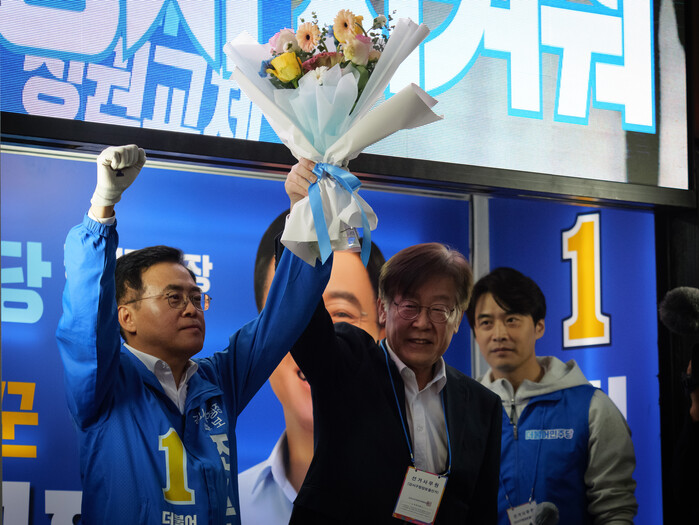 | ▲진 후보 손을 들어올린 이 대표 (사진=시사타파뉴스 이외솔) |