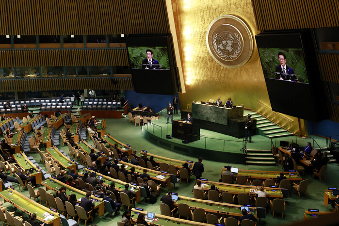 | ▲ 이재명 대통령이 23일(현지시간) 미국 뉴욕 유엔본부 총회장에서 기조연설을 하고 있다. 2025.9.24 (사진=연합뉴스) |