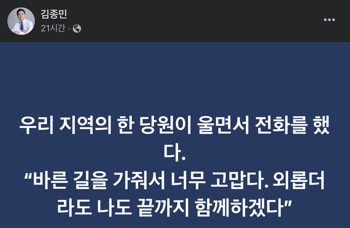 한편, 김종민 의원은 이재명 체포동의안 가결에 동의했다는 사실을 밝히며, 지역 당원이 울면서 전화를 했는데 "바른 길을 가줘서 너무 고맙다"라고 적은 SNS 게시물을 올렸다.