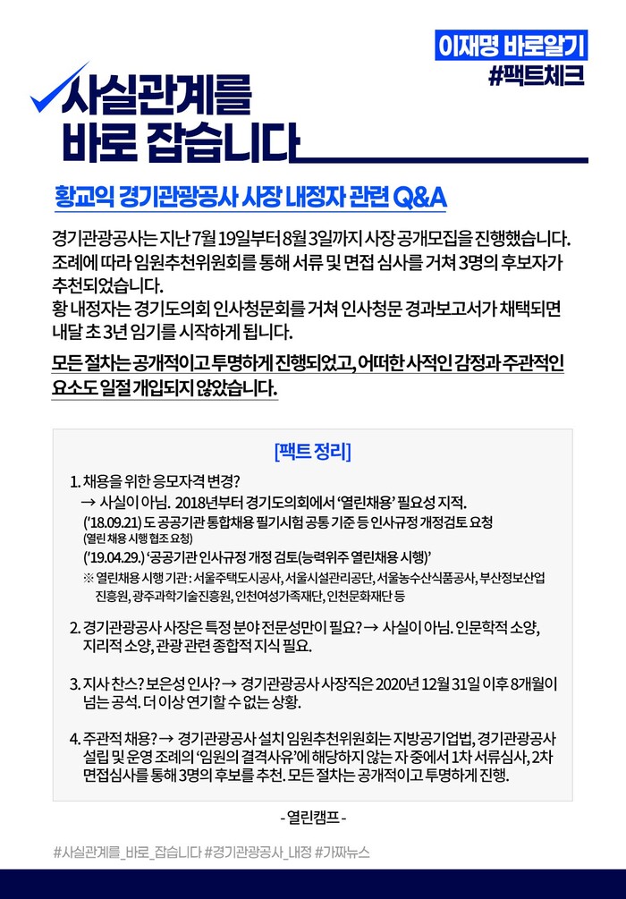 황교익 경기관광공사 사장후보자께서 사퇴의사를 밝혔습니다. 관피아를 막기위해 2018년에 바꾼 공채규정에 따라 임원추천위원회가 공정한 공모절차를 거쳐 추천한 분입니다.