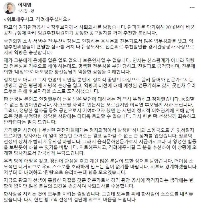 지금도 황교익 선생이 훌륭한 자질을 갖춘 전문가로서 경기 관광 공사에 적격자라는 생각에는 변함이 없지만 많은 분들의 의견을 존중하여 사퇴의사를 수용합니다. 한사람을 지키는 것이 모두를 지키는 출발입니다. 그런데 모두를 위해 한사람이 스스로를 내려놓았습니다. 다시 한번 황교익 선생의 결단에 위로의 마음을 드립니다.