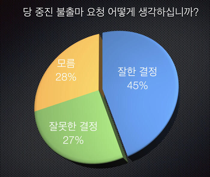 더불어민주당 지지층을 대상으로 한 조사에서는 '잘한 결정이다'라는 응답이 43%, '잘못한 결정이다'라는 응답이 34%로 드러났다.