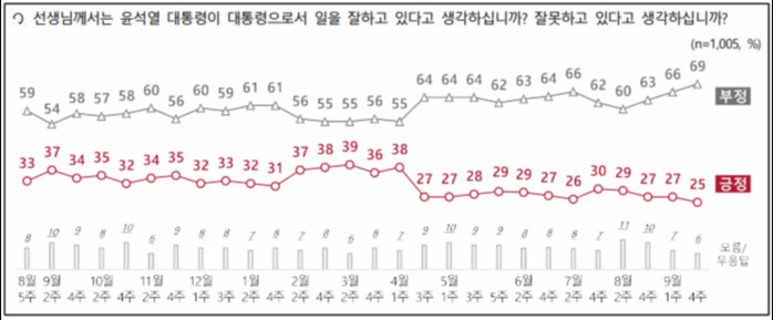 부정 평가 69%는 역대 최고치다. 부정평가는 8월 2주차 때 60%를 기록한 후 3차례 연속 3%p씩 상승하고 있다.