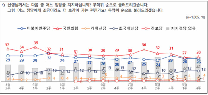 정당지지도는 국민의힘 28%, 더불어민주당 26%, 조국혁신당 12%, 개혁신당 4%, 진보당 1%, 없다/모름·무응답 27%로 나타났다.