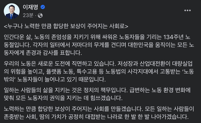 | ▲이재명 대표 페이스북 노동절 메시지 화면 캡쳐 |