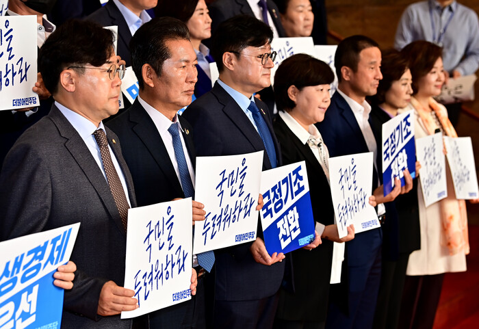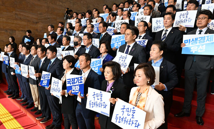 '민생경제가 우선이다', '국민을 두려워하라', '국정기조 전환' (민주당 피켓시위 문구)