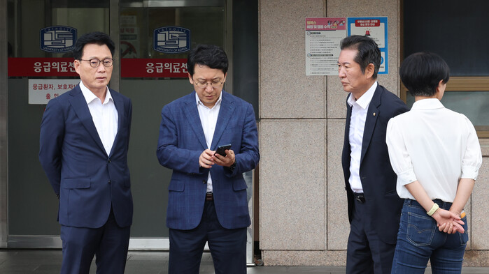 | ▲이송직후 병원 앞에 모인 박광온 원내대표, 천준호 비서실장, 정청래 최고위원 (사진=연합뉴스) |