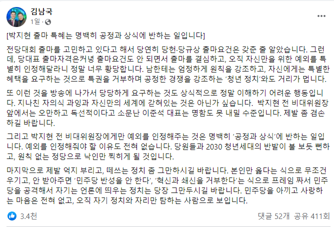 김 의원은 3일 페이스북에서 박지현을 향해 “전당대회 출마를 고민하고 있다고 해서 당연히 당헌‧당규상 출마요건은 갖춘 줄 알았다”며 “출마요건도 안되면서 출마를 결심하고, 오직 자신만을 위해 예외를 특별히 인정해달라니 너무 황당하다.”며 박지현에 대한 소신발언을 이어갔다.