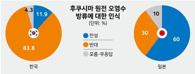 우리 국민 10명 중 8명 이상은 후쿠시마 제1원전의 오염수 해양 방류에 반대하지만, 일본 국민은 10명 중 6명이 찬성한다는 조사 결과가 나왔다.