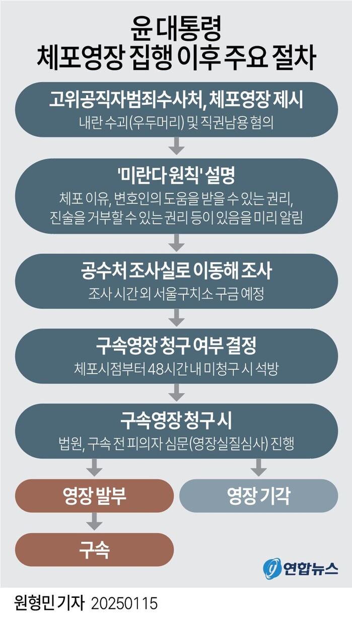 공수처는 이날 오전 10시33분 윤석열 체포영장을 집행했다. 공수처는 정부과천청사에서 윤석열에 대한 피의자 조사를 진행한 뒤 경기 의왕시 서울구치소에 구금할 예정이다.