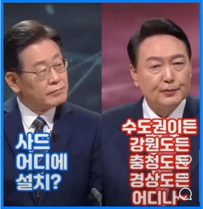 심상정 후보도 ‘사드는 50km 이상 고고도에서 미사일 요격하는 것 아니냐, 수도권 방어를 하려면 제가 이해하는 사드 시스템으로 보면 개성쯤에 배치해야 한다. 그렇지 않고는 불가능하다. 어디 배치하려는 것이냐’고 하니, 윤 후보는 그렇지 않다고 했다.