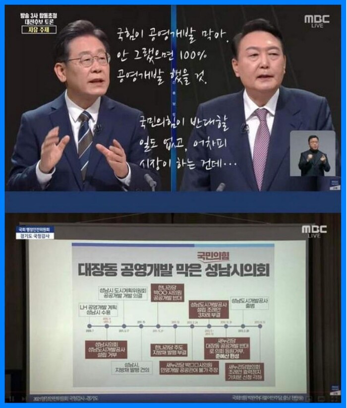 분명한 건, 공공개발 못하게 LH포기시키고, 업자에게 부정대출 봐주고, 거기에서 거기에서 뇌물 받아먹고, 거기서 이익 취하고, 성남시가 공공개발 하는거 못하게 막고 이랬던 국민의 힘과 윤석열 후보께서 하실 말씀은 아니다. 이 말씀 다시 한번 드립니다.