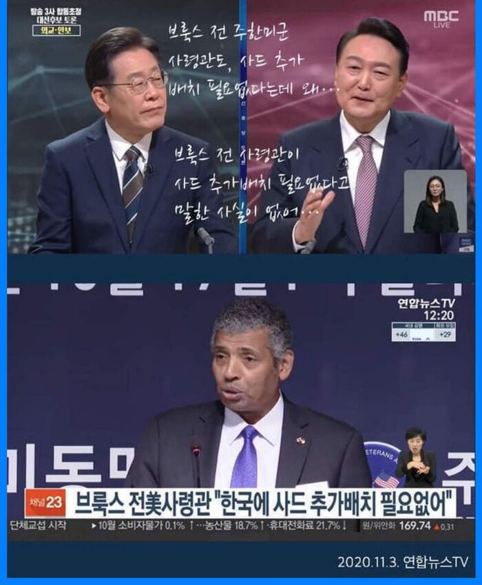 이재명후보는 브룩스 전 주한미군 사령관도 사드 추가 필요없다는데, 왜? 질문을 하니, 윤 후보는 브룩스 전 사령관이 사드 추가배치 필요없다고 말한 사실이 없다고 했다. 하지만, 2020년 11월3일 연합뉴스 TV로 브룩스 전 미 사령관은 "한국에 사드배치 필없다"고 보도가 나갔다.