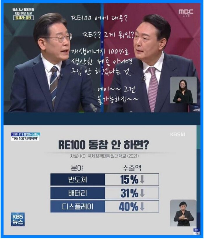 RE100은 "신재생 에너지로 제품을 생산하겠다" 는 것으로, 결국 탄소제로화와 같은 말인데, 윤 후보처럼 석탄 석유만 안 쓴다고 RE100이 되는게 아니라, 전력 생산하는 발전소에서도 탄소가 생산되어서는 안 된다는 것이다.
