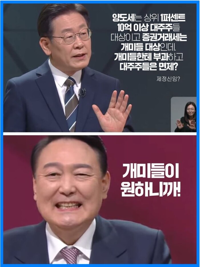 이 후보가 양도세는 1%이산 10억이상 대지주 대상이고, 증권거래세는 개미들이 대상인데, 대지주들 면제해주고 개미들한테 부담시키는거 아닌가요? 하니 윤 후보는 개미들이 원합니다. 라고 했다.