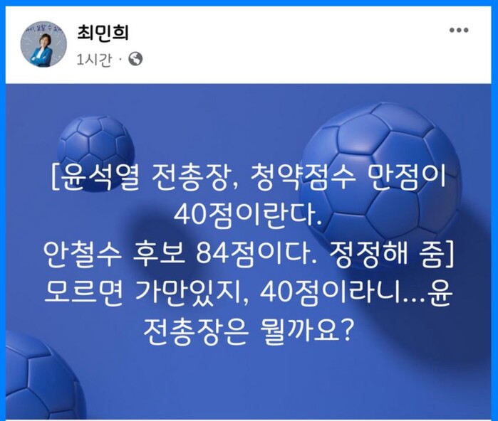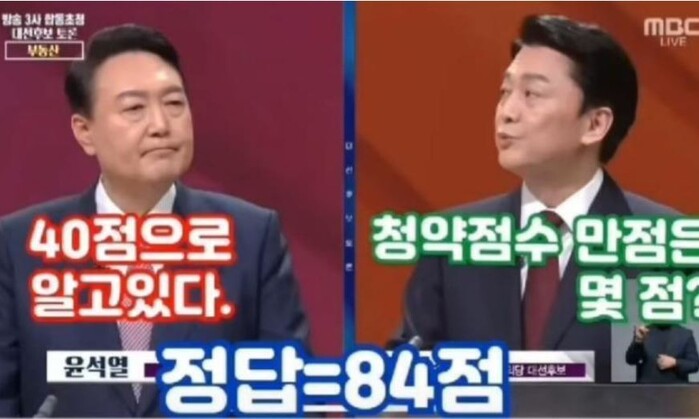 안철수후보가 청약점수 만점은 몇점 인가요? 질문하니, 윤석열 후보는 청약점수를 40점이라고 했다. 이에 안철수 후보는 84점이라고 정정했다. 이에 최민희 전의원은 윤석열 전총장은 청약점수를 40점이 만점이라고 하였다. 이에 안철수 후보는 84점이라고 정정해 주었다. 모르면 가만있지. 40점이라니.. 윤 전 총장은 뭘까요? 라고 하였다.