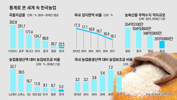 유엔식량농업기구와 농산물시장정보시스템이 발표한 자료에 따르면 국내 곡물자급률은 캐나다(192%), 미국(120.1%), 중국(91.1%)은 물론 일본(27.3%)에도 크게 미치지 못하는 19.3%다.