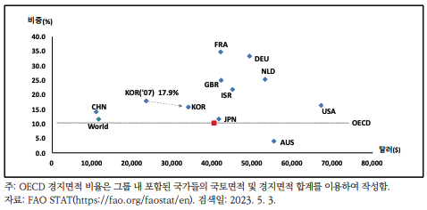 한국농촌경제연구원이 FAO 자료를 분석한 결과에 따르면 2017년 기준 한국 국토면적 대비 경지면적의 비중은 15.7%다. OECD회원국 중 22위이며, 2007년 17.9, 2012년 17.3%에서 2014년 16.9%, 2016년 16.4%로 감소세를 보이고 있다.
