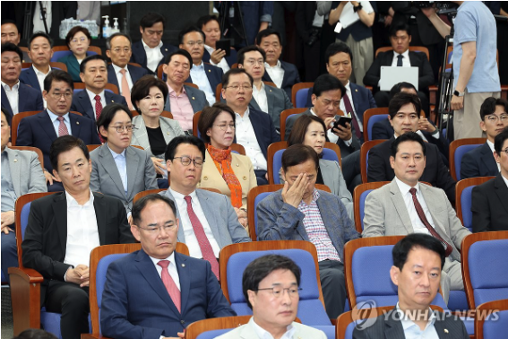 | ▲ 5일 서울 여의도 국회에서 열린 국민의힘 의원총회에서 의원들이 권성동 원내대표의 발언을 듣고 있다. 2025.6.5 (사진=연합뉴스) |