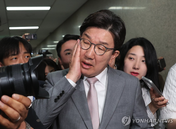 | ▲ 국민의힘 권성동 원내대표가 5일 서울 여의도 국회에서 국민의힘 비상대책위원장실을 나와 원내대표실로 향하던 중 몰려든 취재진의 카메라에 부딪힌 얼굴을 만지고 있다. 2025.6.5 (사진=연합뉴스) |