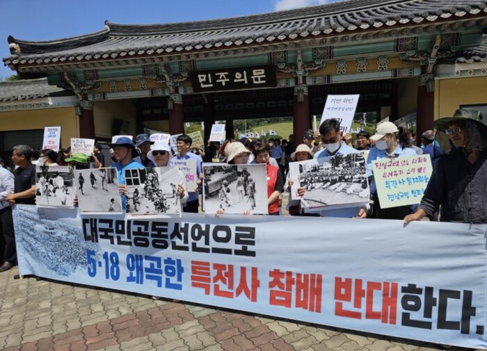 대책위는 "지난 2월19일 두 공법단체(부상자회·공로자회)와 특전사동지회는 '용서와 화해를 위한 대국민공동선언'이란 정치쇼를 펼치며 민주묘지를 짓밟았다"면서 "어떠한 경우에도 오월정신을 훼손하고 역사를 왜곡하는 세력과는 타협하지 않을 것"이라고 주장했다.