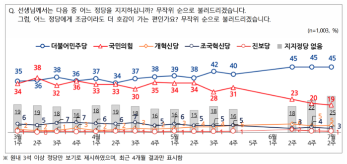정당 지지율에서는 더불어민주당 지지율이 2주 전과 같은 45%를 기록한 가운데 국민의힘 지지율이 1%포인트 하락한 19%로 조사됐다. 양당 격차는 26%포인트로 벌어졌다. 개혁신당은 5%, 조국혁신당은 3%, 진보당은 1%의 지지율을 보였고, 지지하는 정당이 없거나 모른다고 답한 태도유보층은 25%였다.