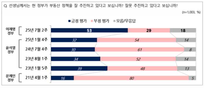 부동산 정책과 관련해 '잘하고 있다'(매우+잘하는 편)라는 긍정 평가가 53%, '잘못하고 있다'(매우+잘못하는 편)는 부정 평가가 29%로 나타났다. 수도권 주택담보대출 한도를 6억원으로 제한하는 등의 부동산 시장 안정화 조치에 대해 '부동산 시장 안정에 도움이 되는 조치'라는 의견이 55%, '실수요자의 내 집 마련에 부담을 줄 수 있는 부적절한 조치'라는 의견이 33%로 조사됐다.