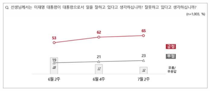 조사 결과에 따르면 이재명 대통령의 국정수행 지지율은 2주 전 조사와 비교해 3%포인트 오른 65%로 나타났다. 부정 평가는 2%포인트 오른 23%였다. 이 대통령은 취임 직후 조사와 비교해 지지율이 무려 12%포인트 올랐다.