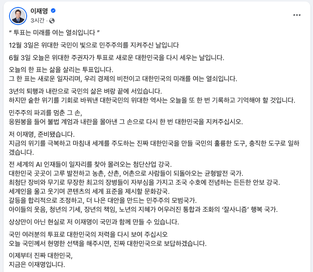 | ▲ 이재명 더불어민주당 대선 후보의 게시글. 2025.6.3 (출처=이재명 페이스북) |