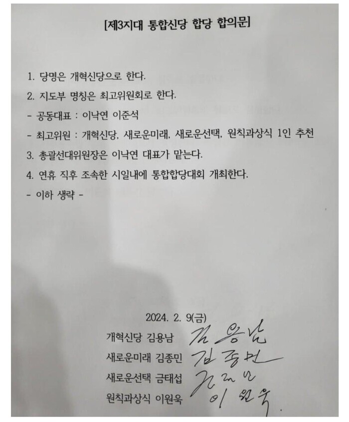 | ▲개혁신당측이 공개한 합의문 (사진=페이스북) |