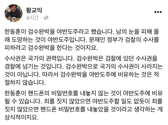 맛 칼럼니스트 황교익 씨가 17일 자신의 페이스북에 "한동훈이 검수완박을 야반도주"라고 한 것에 대해 비판했다.