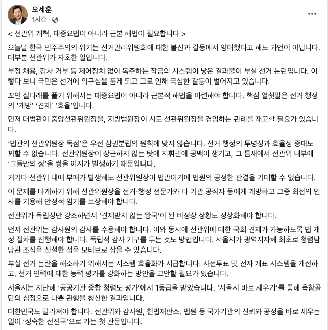 선관위가 감사원 감사를 받아야 한다고 오 시장은 주장했다. 그는 "선관위가 독립성만 강조하면서 '견제 받지 않는 왕국'이 된 비정상 상황도 정상화해야 한다"며 "선관위는 감사원의 감사를 수용해야 한다. 이와 동시에 선관위에 대한 국회 견제가 가능하도록 법 개정 절차를 진행해야 한다. 독립적 감사 기구를 두는 것도 방법"이라고 말했다.