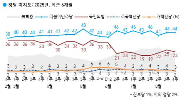 외교 성과로 중도층을 끌어안은 이재명 정부와, 극우 노선으로 중도층에게 외면받은 국민의힘의 희비가 극명하게 엇갈리고 있다.