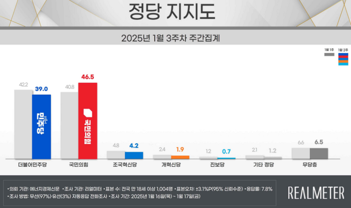리얼미터는 “작년 7월 3주차 국민의힘 42.1%, 민주당 33.2% 이후 6개월 만에 국민의힘이 민주당에 오차범위 밖에서 앞선 것으로 나타났다”며 “국민의힘 지지율은 작년 2월 5주차(46.7%) 이후 처음으로 40% 중반대로 올라섰고 민주당은 작년 8월 2주차(36.8%) 이후 약 5개월 만에 40%대 지지율 선이 무너졌다”고 설명했다.