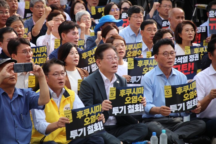 더불어민주당과 정의당, 기본소득당, 진보당 등 야 4당은 26일 서울 한복판에서 대규모 장외집회를 열어 일본 후쿠시마 원전 오염수 해양 방류를 규탄했다.