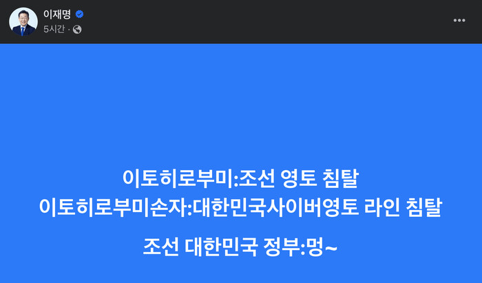 이재명 대표는 10일 밤, 11일 새벽과 아침에 연이어 글을 올리고 우리 정부가 일본의 사이버 영토 침탈에 손을 놓고 있다고 지적했다.