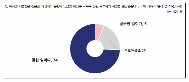 이 대통령의 높은 지지율 배경에는 국민의 목소리에 귀 기울이는 '결단력'이 있었다. 이진숙 교육부 장관 후보자 지명을 철회한 것에 대해 무려 74%가 '잘한 일'이라고 답했다. '잘못한 일'이라는 응답은 6%에 불과했다.