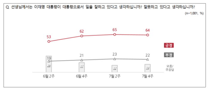 여론조사기관 엠브레인퍼블릭·케이스탯리서치 등이 지난 21일부터 23일까지 실시해 24일 발표한 전국지표조사(NBS) 결과에 따르면, 이 대통령의 국정운영에 대해 '잘하고 있다'는 긍정 평가는 64%에 달했다.