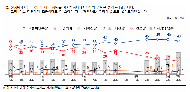 국민의힘, 17%로 역대 최저치 경신하며 '존립 위기'