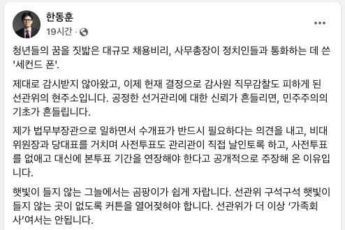 이 의혹에 대해 한 전 대표는 "청년들의 꿈을 짓밟은 대규모 채용비리, 사무총장이 정치인들과 통화하는 데 쓴 '세컨드폰'. 제대로 감시받지 않아 왔고, 이제 헌재 결정으로 감사원 직무감찰도 피하게 된 선관위의 현주소"라며 "공정한 선거관리에 대한 신뢰가 흔들리면, 민주주의의 기초가 흔들린다"고 했다.
